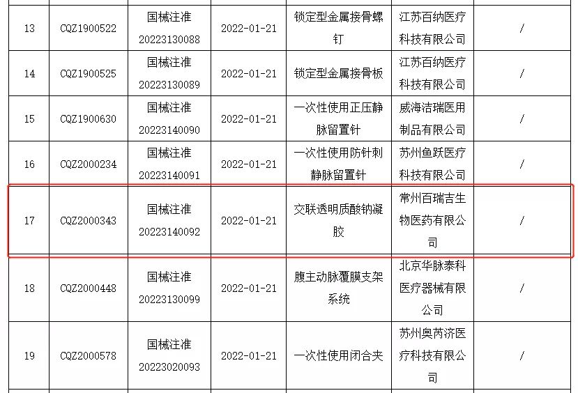 2022年1月26日,常州百瑞吉生物醫(yī)藥有限公司生產(chǎn)的產(chǎn)品“交聯(lián)透明質(zhì)酸鈉凝膠”獲NMPA批準上市(國械注準20223140092),產(chǎn)品用于預(yù)防盆腹腔術(shù)后粘連,恭喜百瑞吉產(chǎn)品獲得市場準入。