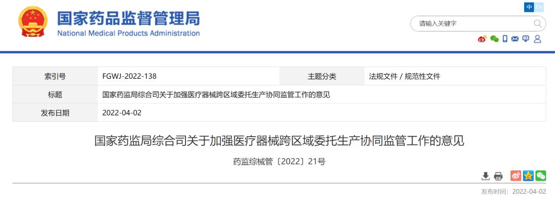 國(guó)家藥監(jiān)局綜合司關(guān)于加強(qiáng)醫(yī)療器械跨區(qū)域委托生產(chǎn)協(xié)同監(jiān)管工作的意見(jiàn)