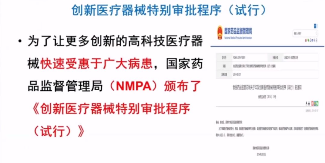 2014年2月7日,為保障醫(yī)療器械的安全有效,鼓勵醫(yī)療器械的研究與創(chuàng)新,促進(jìn)醫(yī)療器械新技術(shù)的推廣應(yīng)用,推動醫(yī)療器械產(chǎn)業(yè)發(fā)展,國家藥監(jiān)局制定了《創(chuàng)新醫(yī)療器械特別審批程序(試行)》,政策從創(chuàng)新產(chǎn)品定義、提交資料、證明性文件、等方面規(guī)定了創(chuàng)新器械審批流程和要點。