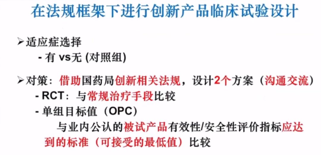 在法規(guī)框架下進(jìn)行創(chuàng)新產(chǎn)品的臨床試驗設(shè)計,李教授認(rèn)為最關(guān)鍵的是適應(yīng)癥的選擇問題(有無對照組),可設(shè)計出2個方案,以便和國家藥監(jiān)局相關(guān)部門溝通。