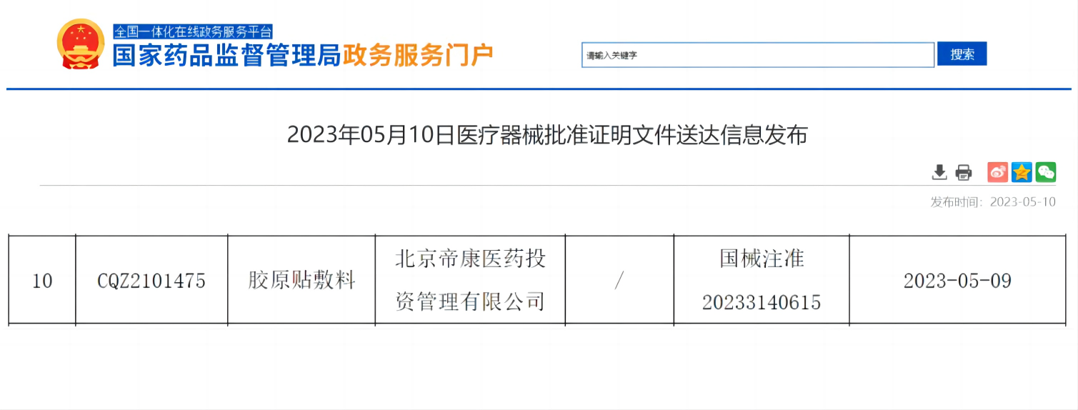 2023年5月9日,奧泰康北京CDMO中心取得「首張」國家藥監(jiān)局批準的三類醫(yī)療器械注冊證(國械注準20233140615),系全國首個以細胞外基質(zhì)來源的膠原蛋白為原料制備的三類膠原貼敷料。此項目是北京CDMO中心基于“十三五”國家重點研發(fā)計劃項目,在MAH制度下,與湖北恒安芙林藥業(yè)股份有限公司戰(zhàn)略合作完成涵蓋市場準入全流程業(yè)務的醫(yī)美類項目,也是器械CRO/CDMO行業(yè)受托研發(fā)誕生的全國首個三類醫(yī)療器械注冊證,具有里程碑意義。