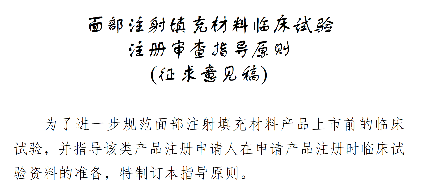 為進(jìn)一步規(guī)范面部注射填充材料產(chǎn)品上市前的臨床試驗(yàn),國(guó)家藥監(jiān)局器審中心發(fā)布《面部注射填充材料臨床試驗(yàn)注冊(cè)審查指導(dǎo)原則(征求意見(jiàn)稿)》,針對(duì)不用材料面部注射產(chǎn)品臨床試驗(yàn)中的適用范圍、試驗(yàn)設(shè)計(jì)、臨床評(píng)價(jià)指標(biāo)、樣本量、入排標(biāo)準(zhǔn)等進(jìn)行了規(guī)范。