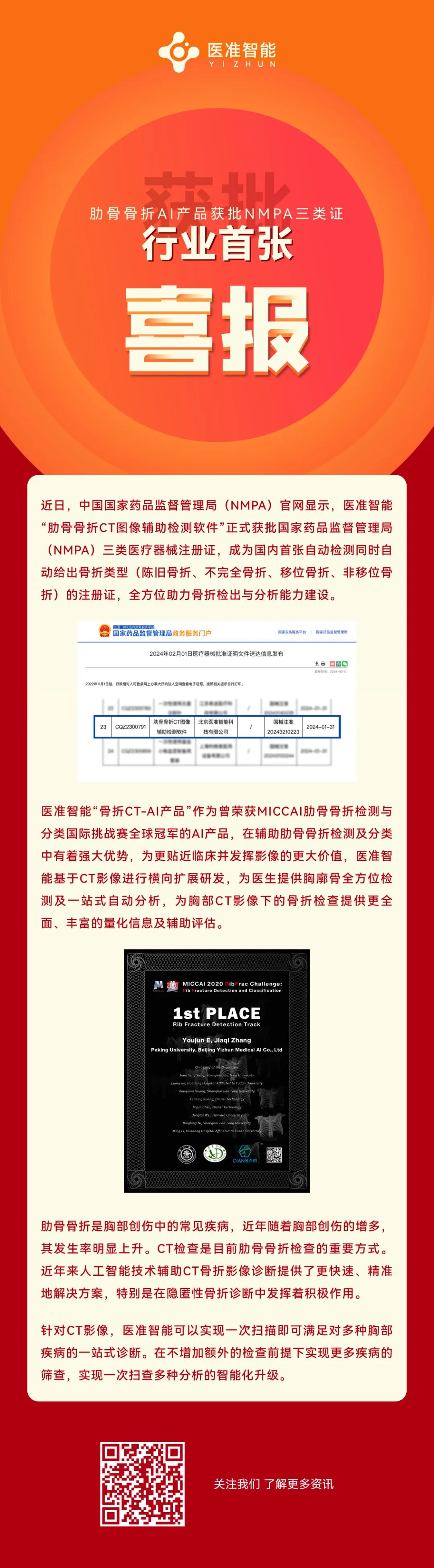 2024年1月31日,經(jīng)國家藥品監(jiān)督管理局公示,北京醫(yī)準(zhǔn)智能科技有限公司的肋骨骨折CT圖像輔助檢測軟件(國械注準(zhǔn)20243210223)獲得NMPA批準(zhǔn)上市,奧泰康承擔(dān)本項(xiàng)目部分臨床試驗(yàn)工作,系2024年奧泰康助力獲得的第二張三類醫(yī)療器械注冊證。