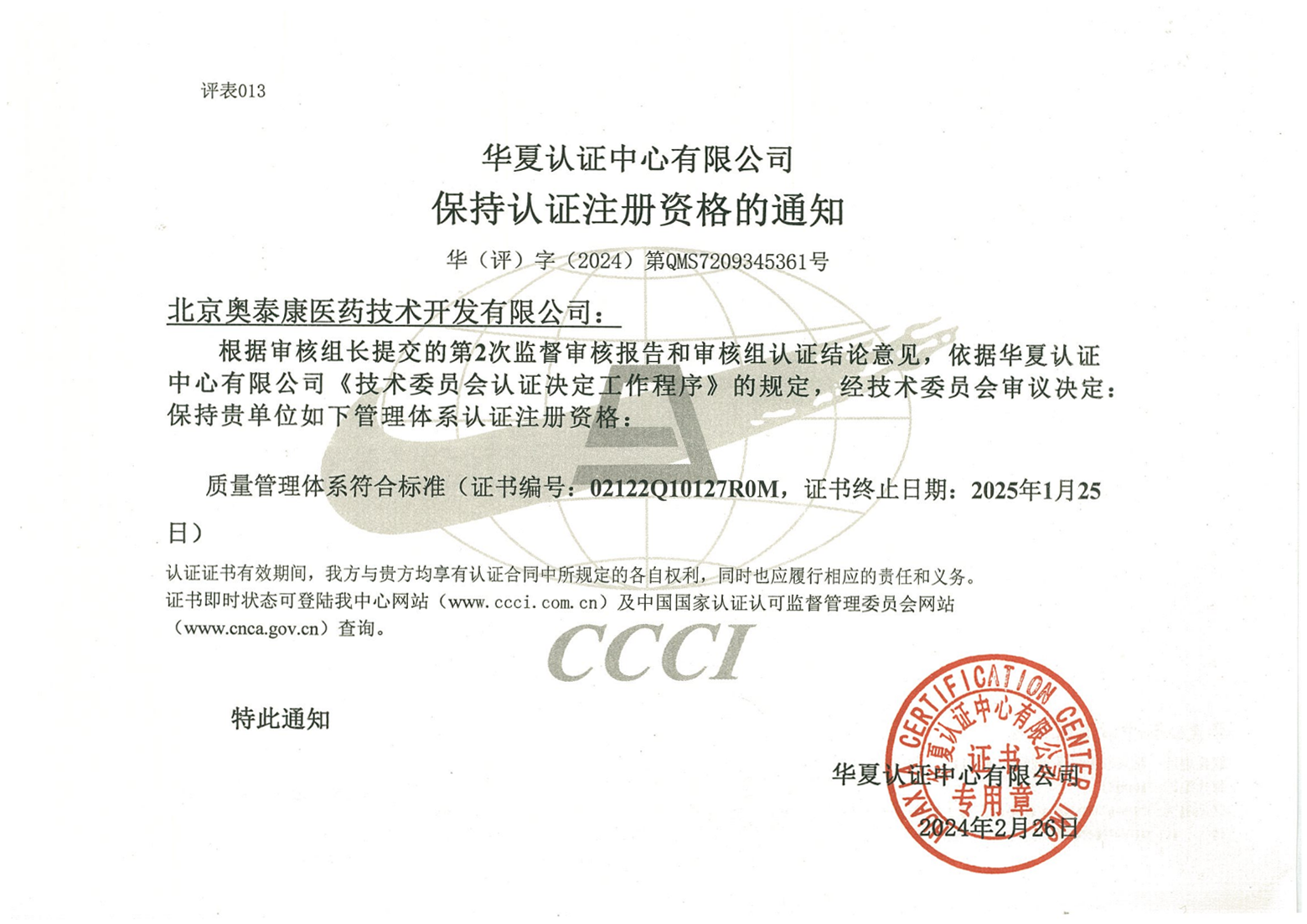 近日,北京奧泰康醫(yī)藥技術(shù)開發(fā)有限公司經(jīng)華夏認證中心有限公司(CCCI)認證,順利通過ISO9001:2015 標(biāo)準質(zhì)量管理體系認證年度審核,認證范圍為醫(yī)療器械臨床試驗及產(chǎn)品注冊服務(wù)。