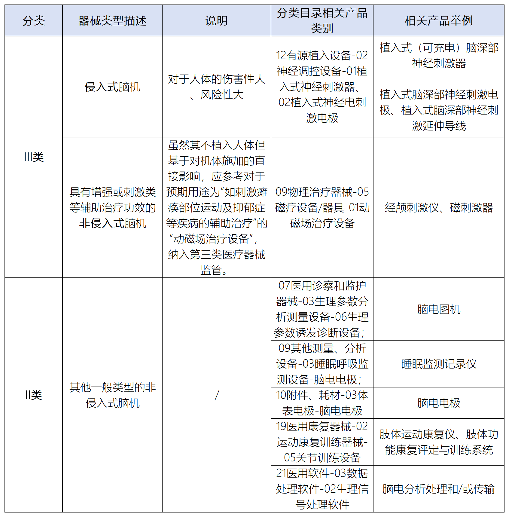 中國器審發(fā)布的《腦機接口的監(jiān)管現(xiàn)狀》指出,由于III類醫(yī)療器械在注冊難度、監(jiān)管要求、申請受理部門層級和申請時長等方面都遠高于II類醫(yī)療器械,我國腦機企業(yè)目前大多選擇非侵入式采集技術(shù)路線。對于侵入式腦機設(shè)備,目前都處在臨床性研究和動物實驗階段。目前暫無公開性的由國家藥品監(jiān)督管理局正式批準(zhǔn)進入人體臨床試驗階段的侵入式腦機器械。根據(jù)廣義BCI的定義,結(jié)合我國現(xiàn)行《醫(yī)療器械分類目錄》的規(guī)定,與BCI相關(guān)設(shè)備的分類主要為II類和III類: