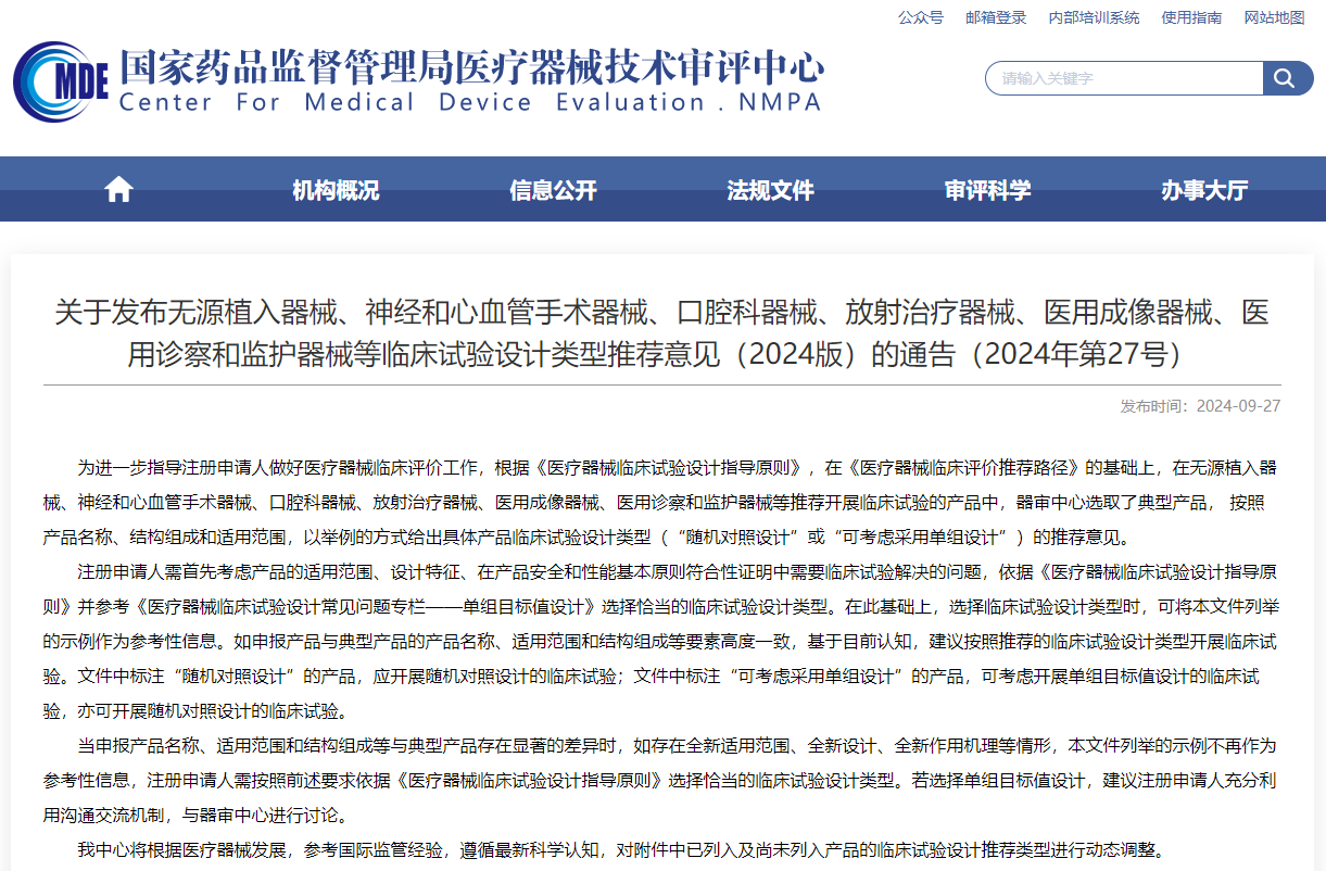 近日,器審中心發(fā)布《無(wú)源植入器械、神經(jīng)和心血管手術(shù)器械、口腔科器械、放射治療器械、醫(yī)用成像器械、醫(yī)用診察和監(jiān)護(hù)器械等臨床試驗(yàn)設(shè)計(jì)類型推薦意見(jiàn)(2024版)的通告》。