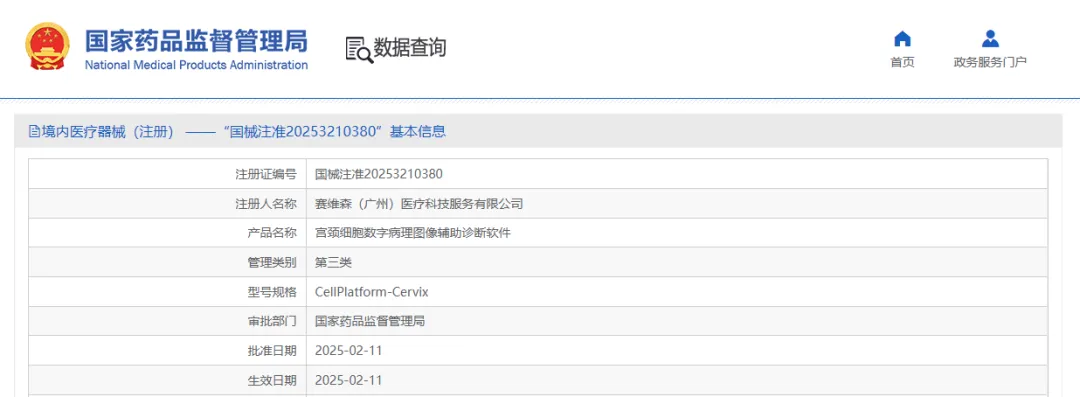 賽維森科技自主研發(fā)的“宮頸細(xì)胞數(shù)字病理圖像輔助診斷軟件”,正式獲得國(guó)家藥監(jiān)局(NMPA)頒發(fā)的第三類醫(yī)療器械注冊(cè)證,是宮頸細(xì)胞學(xué)領(lǐng)域首張“輔助診斷”三類證。人工智能正式升級(jí)為醫(yī)生的“超級(jí)助手”?。ㄗ?cè)證編號(hào):國(guó)械注準(zhǔn)20253210380)